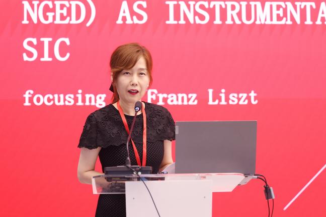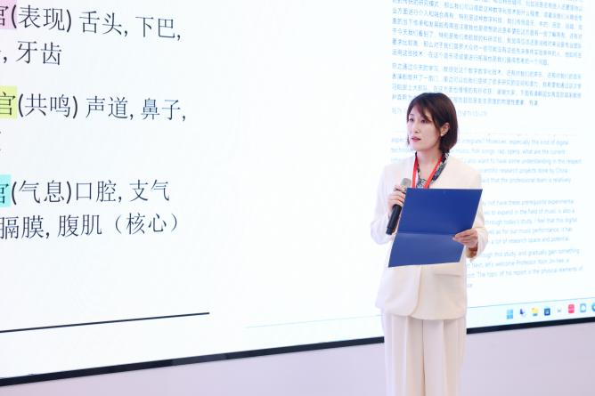 海牙和乌得勒支音乐学院客座教师João Luís Veloso Paixão在会议中分析了18世纪面部表情在激情演唱中对现代表演的贡献。马德里歌剧清唱剧指挥教授Mariano Rivas的报告聚焦于探讨克服指挥练习中的技术障碍。南通大学外籍教师Beatrice Fanetti做了题为“传播你的声音:声乐课中隐喻的使用”的报告,指出在声乐教学中,隐喻的使用可以更好地理解和表现音乐作品,激发其音乐表达的潜能,提高学习的效果和乐趣。韩国女子大学音乐系教师KIM, Han Wook分析了人工智能时代文化艺术变革的前景。南京特殊教育师范学院宋博媛教授探讨了歌唱与呼吸训练在慢性阻塞性肺病康复中的个案研究,包括如何通过歌唱和呼吸训练来改善肺部功能、增强呼吸肌力量、提升肺活量和气流控制能力等方面的内容。湖南理工学院王桂芹老师的报告强调了如何通过数字科技赋能声乐表演教学。韩国梨花女子大学、全州教育大学、光州神学大学、秋溪艺术大学外聘教授尹真熙的报告旨在分析发声原理的物理性要素,以帮助听众深入了解声音产生的基本原理和影响因素。