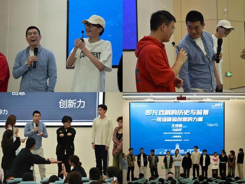 王煜鑫老师深入介绍了即兴戏剧的发展历程、行业现状及未来趋势。他生动风趣的讲解让同学们对即兴戏剧有了更深入的认识和理解。讲座过程中,特别设置了多个即兴互动环节,来自自动化学院、电子信息工程学院、民航学院、经济与管理学院、禁忌书屋 、计算机科学与技术学院、通用航空与飞行学院、物理学院等不同专业的同学们积极参与,上台体验即兴表演。从最初的紧张拘谨到逐渐放开,参与学生们在笑声与掌声中突破自我,在自由与创意的氛围中共同创作,创造了许多精彩的故事和瞬间,为在场观众带来了妙趣横生的观演体验。