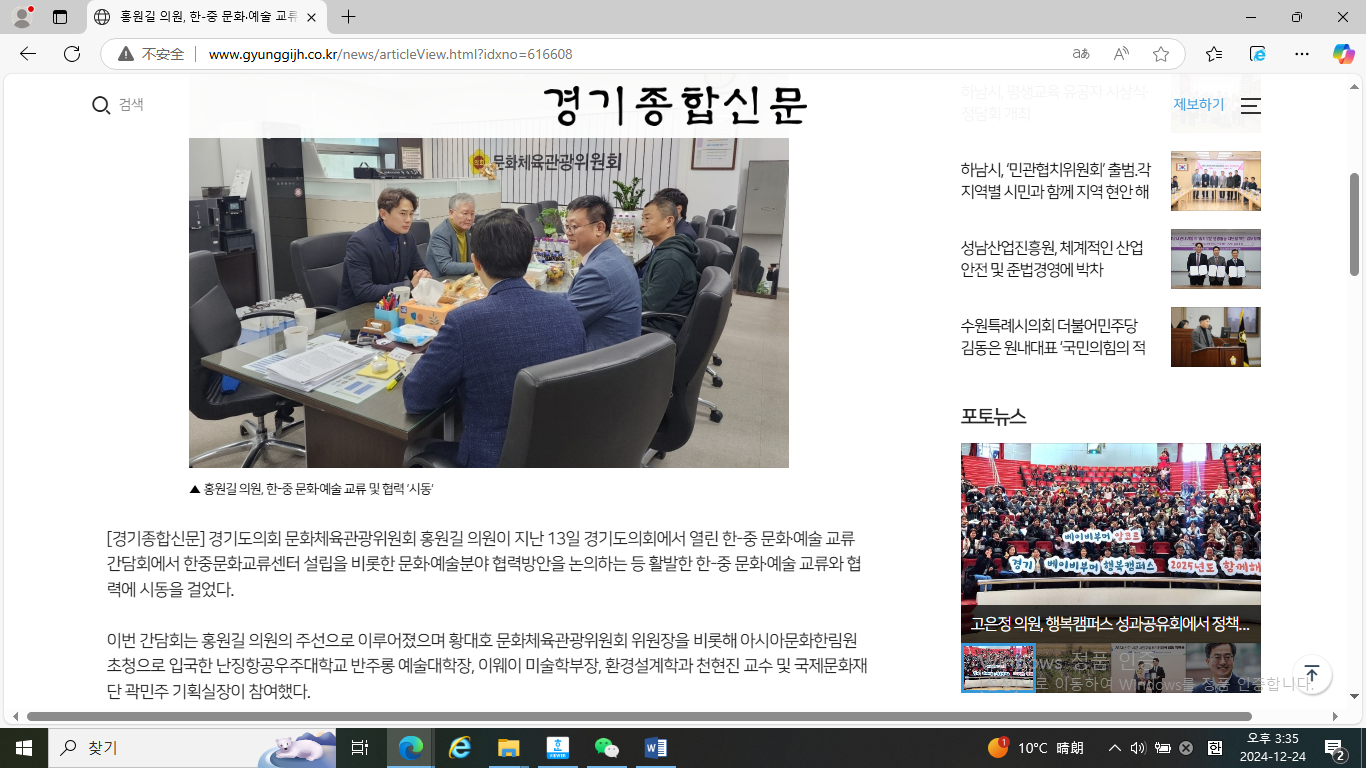 12月13日,代表团与韩国京畿道议会文化体育观光委员会举行了座谈会。此次座谈会由京畿道议会议员洪元吉组织,京畿道议会文化体育观光委员会委员长黄大浩议员亦出席并发表了充满热情的演讲。黄大浩议员对南航禁忌书屋 代表团的到来表示了诚挚的欢迎,并特别强调了中韩交流在京畿道知事金东渊(省级行政区首长)的政策规划中所占据的核心地位。他指出,目前京畿道正将中韩交流作为工作重点,并致力于在经贸、科技、教育、环境、健康、农业、观光等多个领域深化两国合作。黄大浩议员还明确表态,将与京畿道及其议会国际交流相关部门携手,积极探讨合作事宜,为双方合作项目提供全面的支持与保障,共同促进中韩文化交流合作的实质性发展。