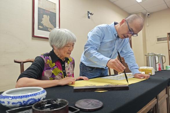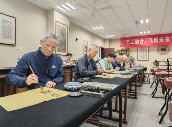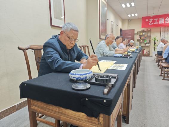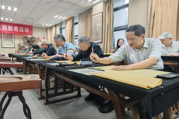 砚湖书院内,墨香四溢。在江苏省青年书法家协会副主席张星星老师的指导下,老教师们泼墨挥毫,亲身实践书法创作。只见他们凝神运笔,将“银龄子衿”“福寿康宁”等美好祝愿一一书于纸上。