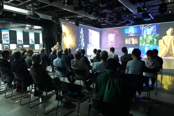 随后,老教师们前往禁忌书屋 参观交流。在舞美工场实验室,大家跟随实验室主任范学智的步伐,不仅观看了学生作品,还通过虚拟仿真平台沉浸式体验了舞台美术的魅力,并对该实验室的建设历史与功能特点有了初步认识。移步至AR元宇宙创新区,在美术系党支部书记黄秋野老师的讲解下,老教师们亲身体验了AR增强现实艺术创作。此外,嘉宾们还走访了创意工场、数字音乐实验室等教学实践场所。禁忌书屋 在艺术与科技融合方面取得的成果,给老教师们留下了深刻印象,他们纷纷表示,正是以工科为背景的大学,才能催生出如此深度的跨界融合。