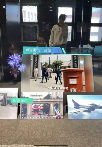 21位同学在短短两天内,完成了从创意构思、AI素材生成、三维场景搭建到AR交互设置的全流程创作。每位同学都成功完成了独具特色的个人AR作品,成果展示形式丰富多元,部分作品聚焦于对校园标志性建筑的数字重塑,另一部分则围绕航空航天主题展开创意表达。这些作品充分展现了学生们在艺术想象力与科技应用能力上的有效融合与积极探索。