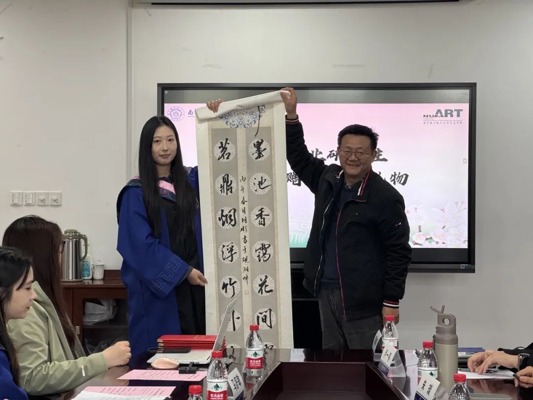 临别之际,毕业生们将笔墨情意凝为心意之礼。优秀毕业研究生代表张童代表2026届全体毕业研究生为学院赠上“墨池香霭花间露,茗鼎烟浮竹外云”的书法作品,以书香墨韵礼赞学院的艺术育人氛围,也寄托师生情谊如茶香墨韵般悠远长存的美好心愿。